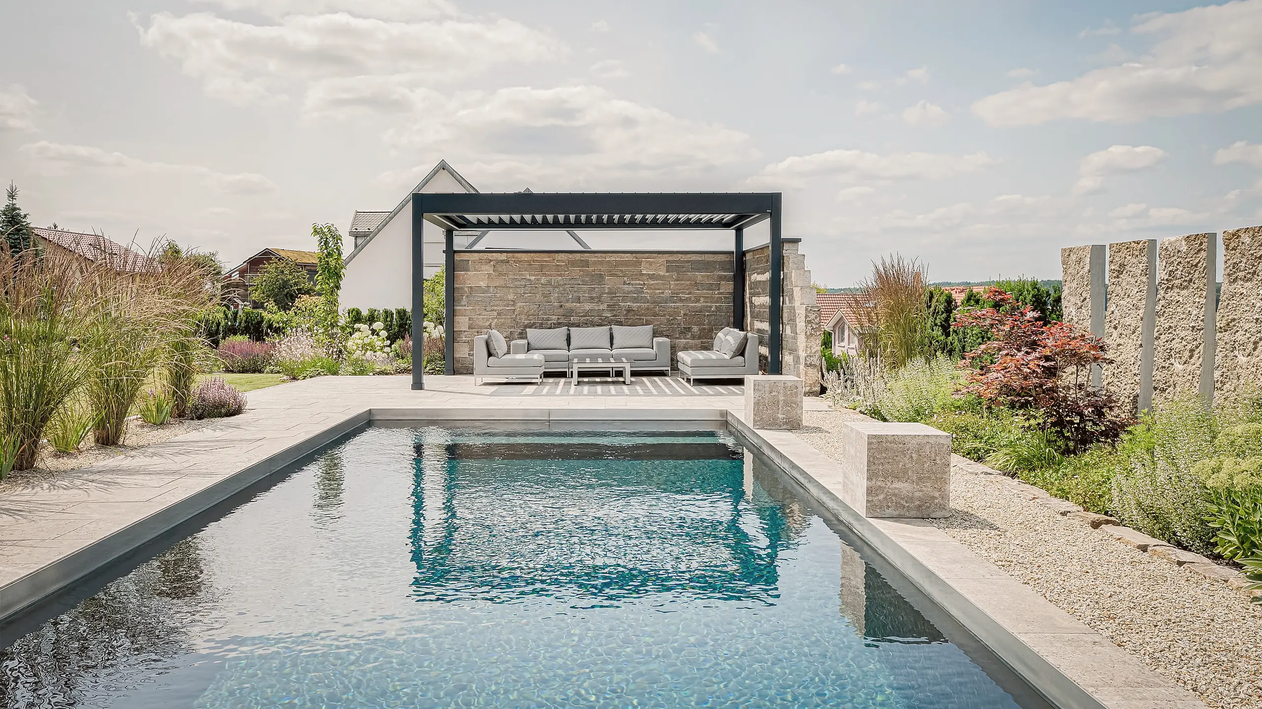 Optimale Rahmenbedingungen für entspanntes Outdoor Living schaffen die Sonnenschutzprodukte von HELLA – zum Beispiel die Pergolen, die nicht nur Schatten spenden, sondern auch vor Regen und je nach Ausstattung auch vor Wind schützen.