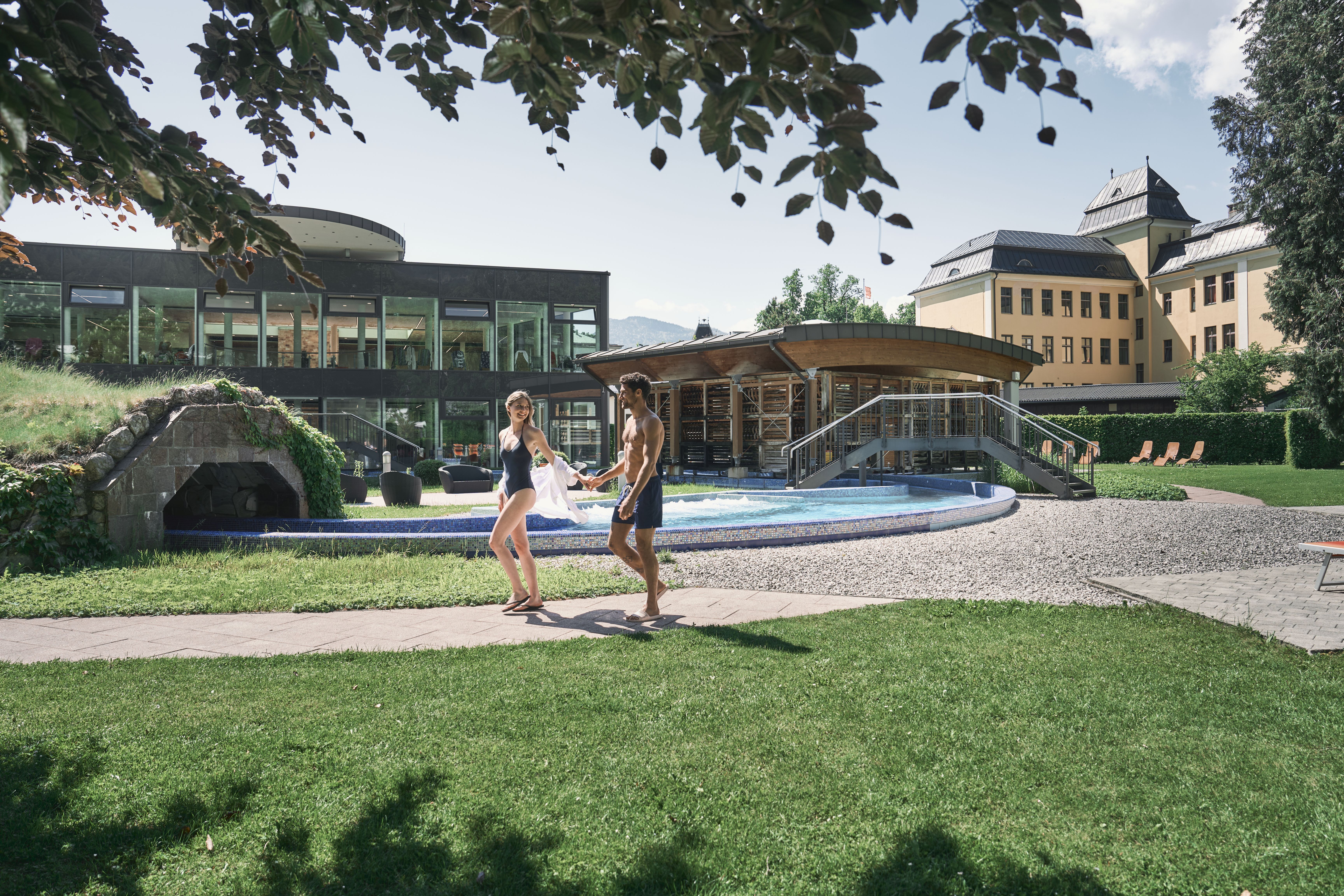 Die direkt angeschlossene Thermen- und Saunalandschaft erreicht der Royal****s-Gast bequem im Bademantel über den Panorama-Verbindungsgang, der Eintritt ist auch am An- und Abreisetag ganztags inklusive.